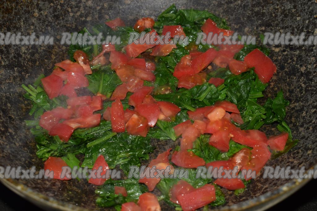 К размягченному шпинату выкладываем помидоры, нарезанные на мелкие кубики, солим, перчим по вкусу. Тушим шпинат с помидорчиками, иногда помешивая, примерно, 3 минуты (до готовности помидоров).