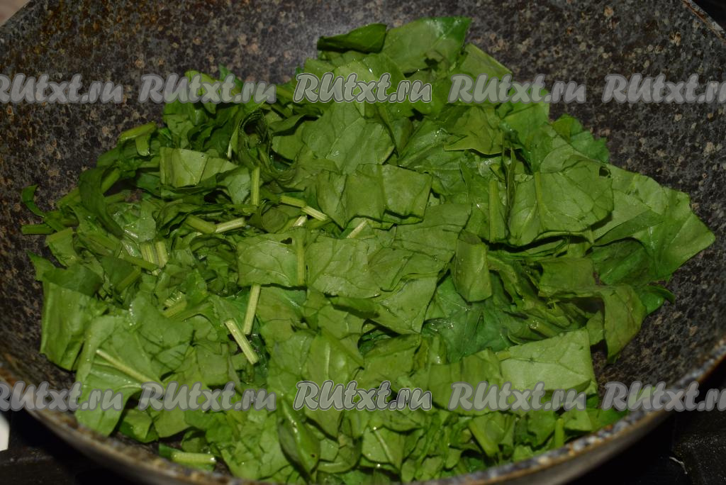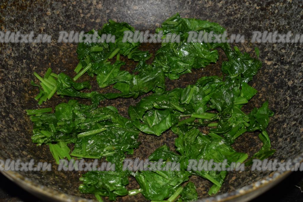Разогреваем сковороду на слабом огне, добавляем растительное масло. Шпинат нарезаем на полоски, выкладываем на сковороду, разогретую с маслом, и слегка обжариваем его на слабом огне, иногда помешивая (примерно, 2 минуты).Шаг 2 из 6: