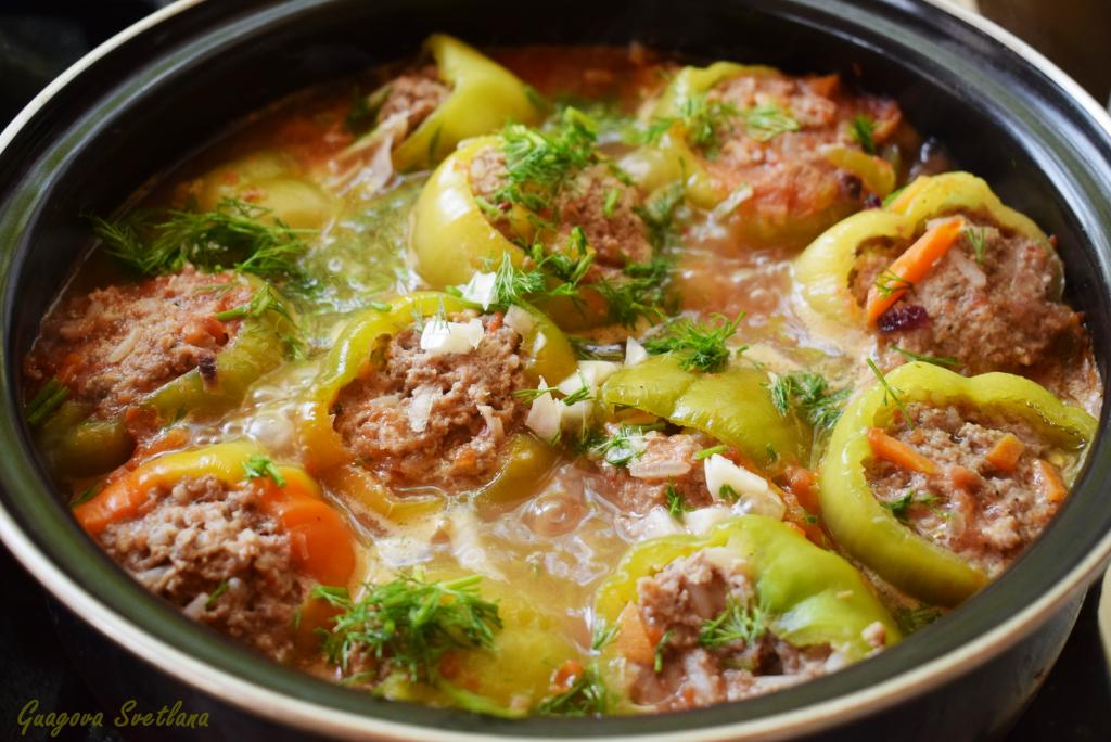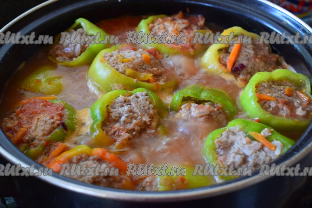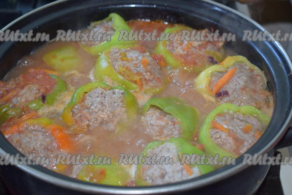 Далее ставим кастрюлю с фаршированными перцами на умеренный огонь, доводим до кипения, солим и перчим по вкусу. Накрываем кастрюлю крышкой и готовим, примерно, 35-40 минут на небольшом огне. По прошествии времени фаршированные перчики будут полностью готовы. Такое аппетитное, сытное, по-настоящему домашнее блюдо придется по вкусу многим!