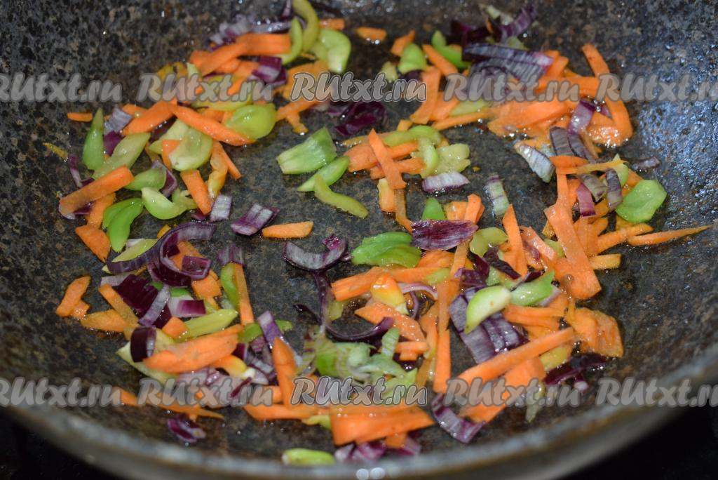 Теперь приготовим зажарку, для этого нарежем очищенный лук мелкими кубиками, очищенную морковь нарежем соломкой, оставшийся на крышечках болгарский перец нарежем на полосочки. В сковороду наливаем растительное масло и добавляем лук, морковь и болгарский перец.