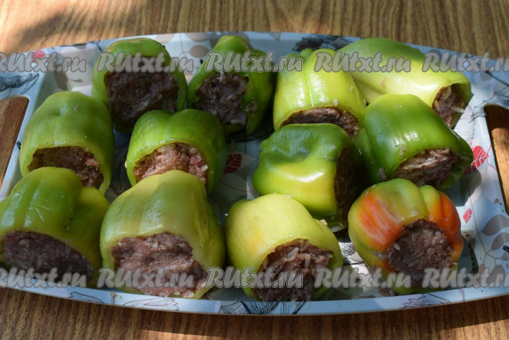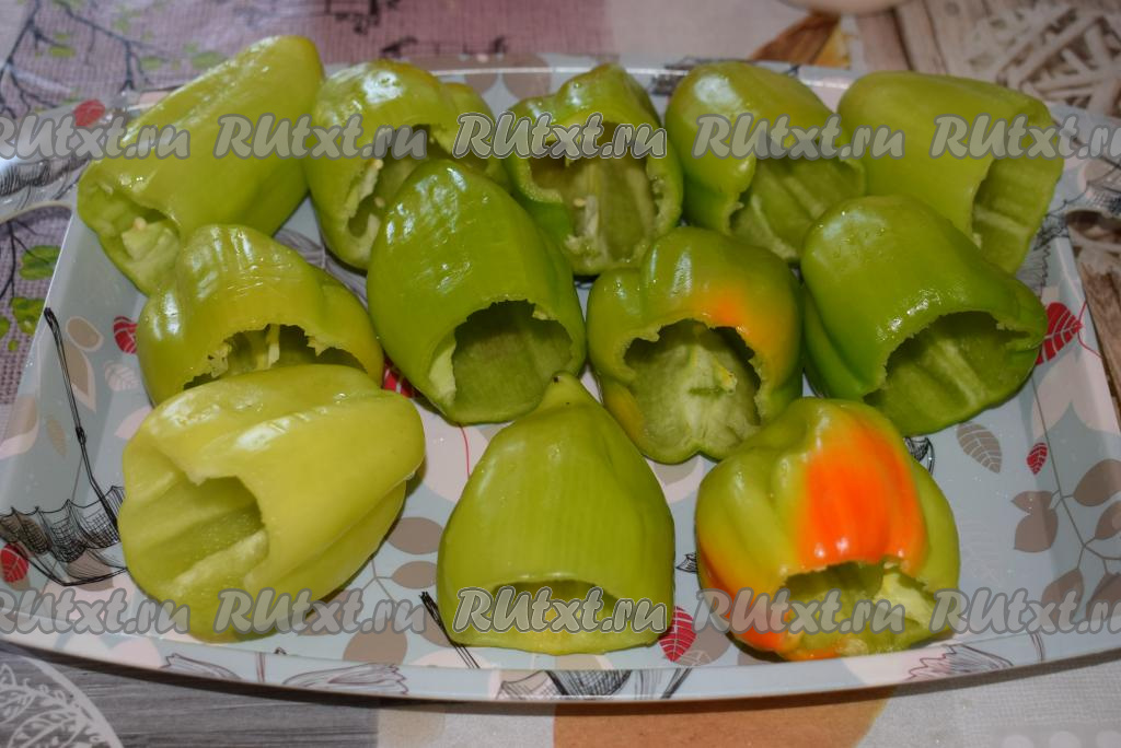 Затем заготовки болгарских перцев наполняем фаршем из мяса и риса.