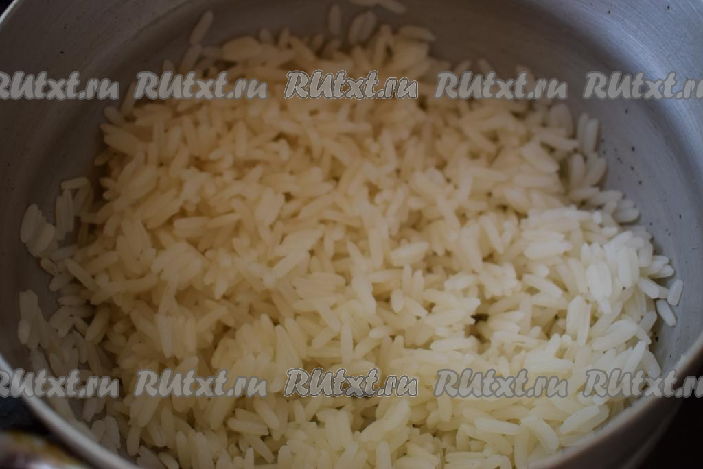 В это время отварим рис до готовности, для этого заливаем рис водой и варим с момента закипания, примерно, 10 минут (до готовности), солим по вкусу. Сольем с готового риса воду и промоем под холодной водой.