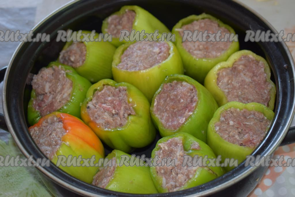 В плоскую широкую кастрюлю выкладываем подготовленные фаршированные перцы.