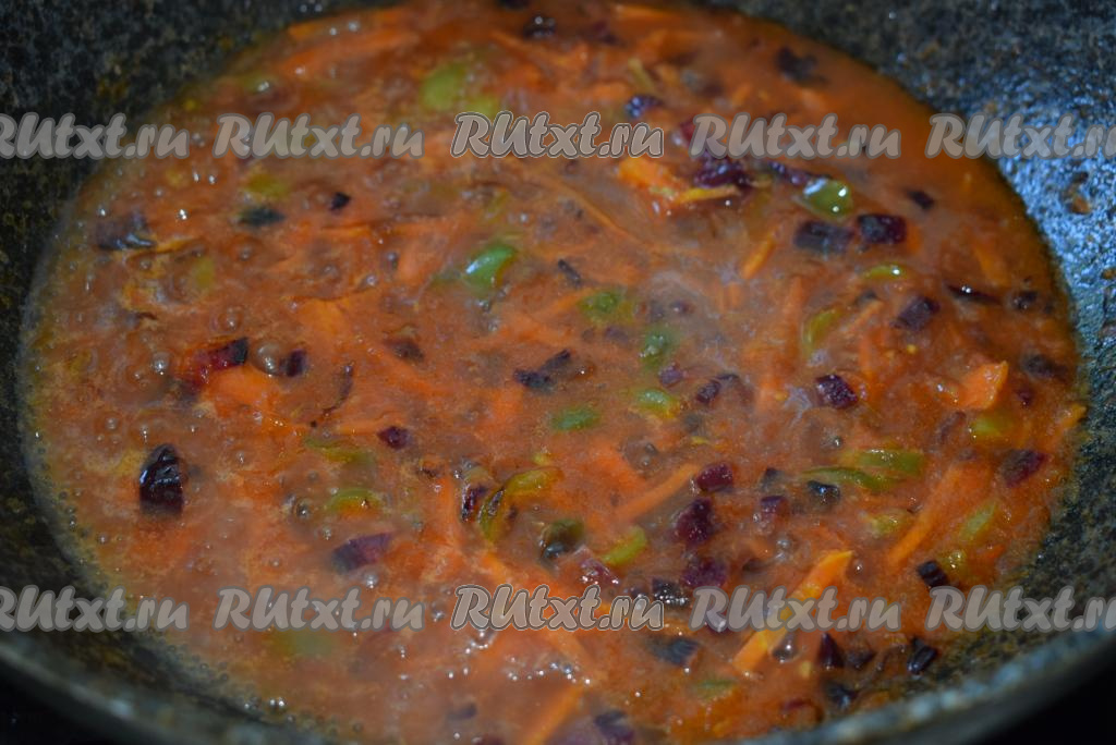Томим овощи на слабом огне, иногда перемешивая, до мягкости (примерно, 5-7 минут). Затем добавляем к овощам помидор, нарезанный на кубики (или натертый на крупной терке), и продолжаем готовить зажарку еще 3-4 минуты.