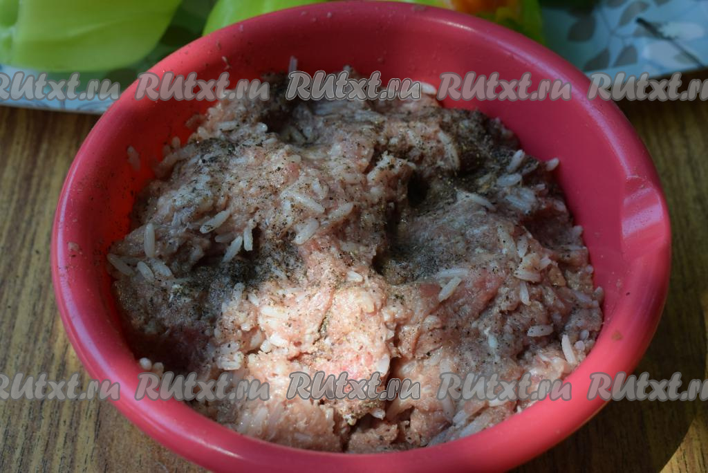 Приготовленный рис добавим к мясному фаршу, перемешаем до однородности и наша начинка для фарширования болгарских перцев готова.