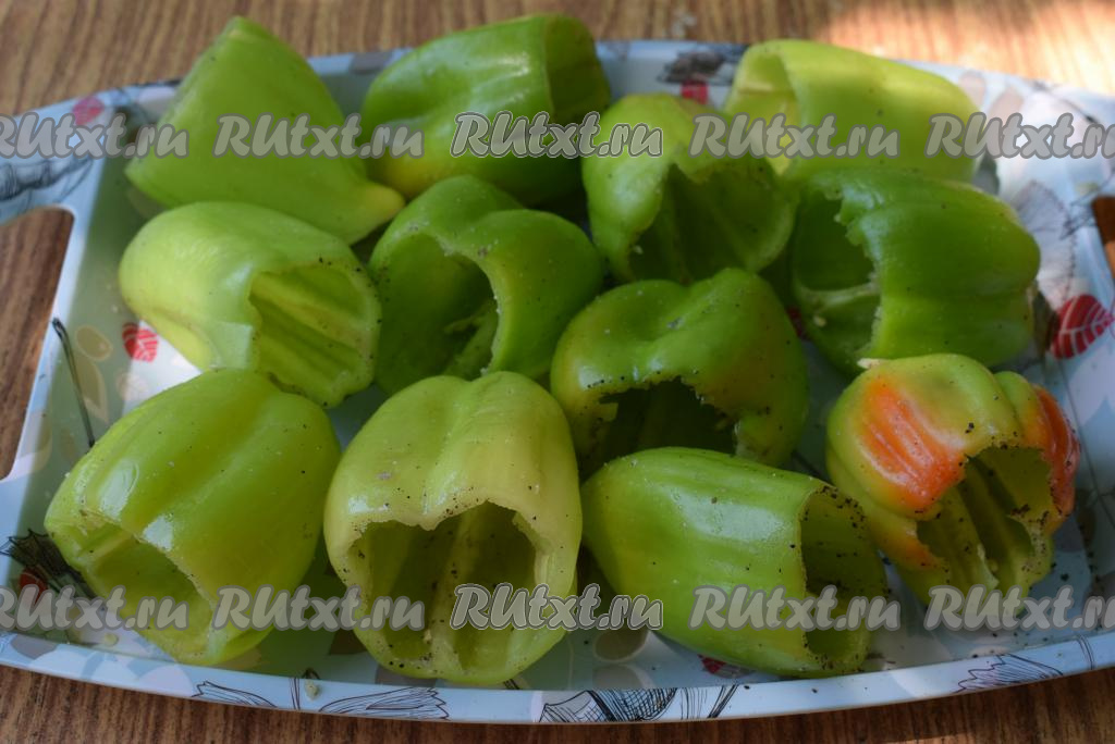 Далее берем каждый перец, натираем его солью и черным молотым перцем внутри для того, чтобы перчик был вкусным, а не пресным.