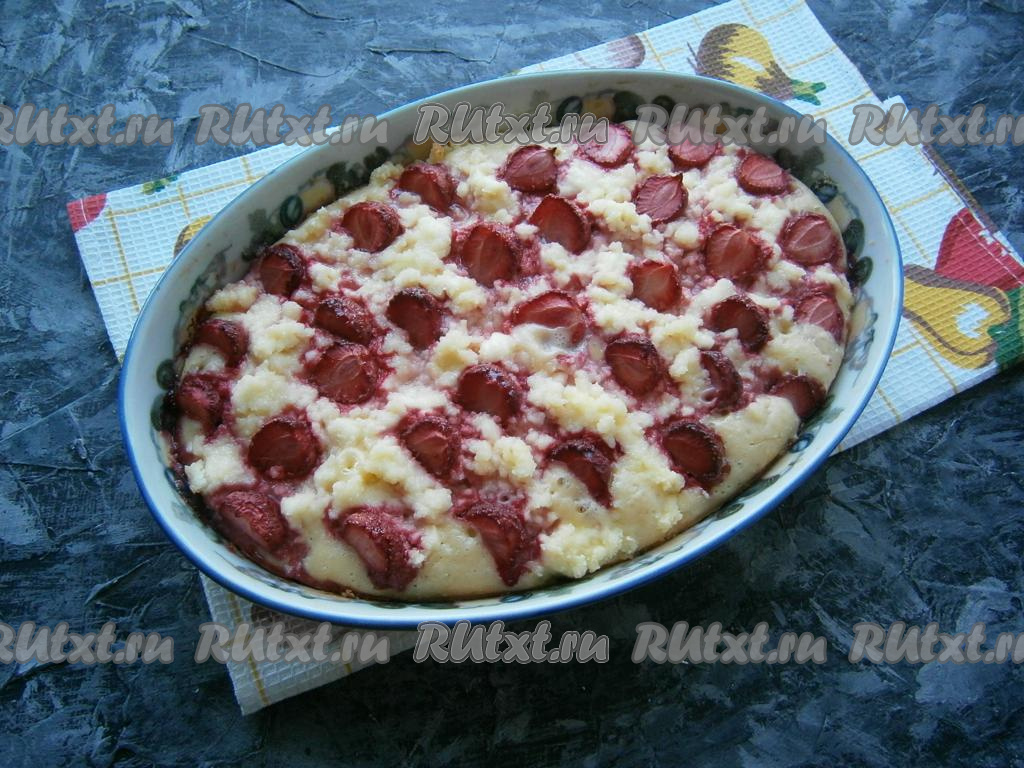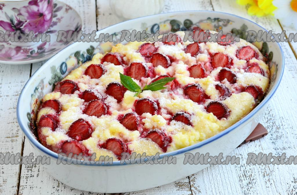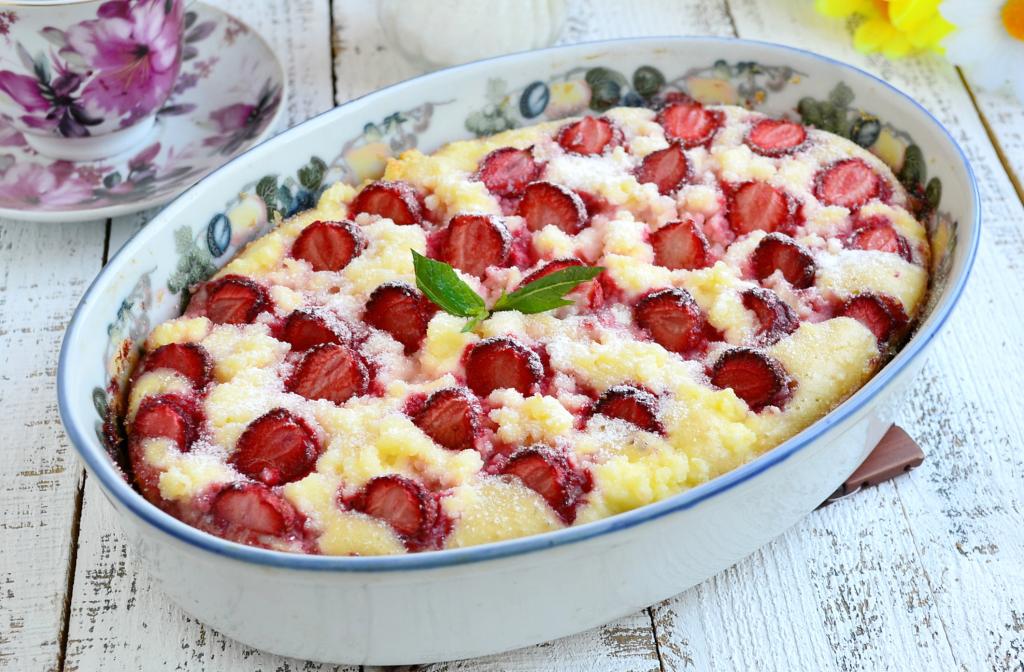 Выпекать творожно-клубничный пирог в разогретой духовке около 40-45 минут при температуре 170-180 градусов.