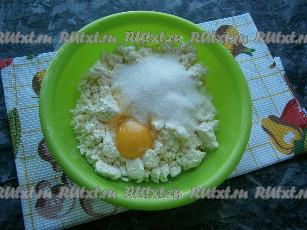 Для приготовления начинки в творог добавить сырое яйцо, 2 столовые ложки сахара и ванильный сахар.