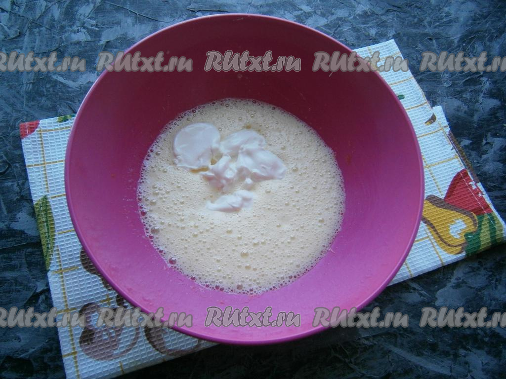 Яйца с сахаром и солью взбить миксером до пышной, светлой массы (на это потребуется 3-4 минуты). Затем добавить сметану и еще раз взбить миксером.