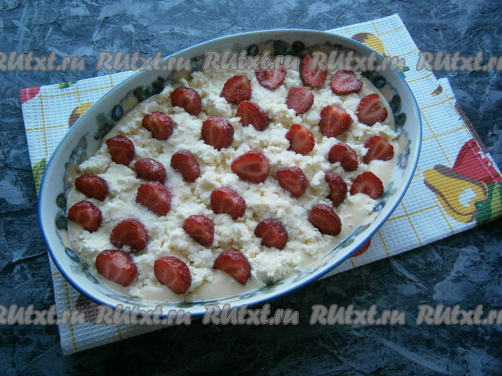 Клубнику нарезать на половинки (или четвертинки) и распределить ее по творогу, посыпать оставшейся 1 столовой ложкой сахара.