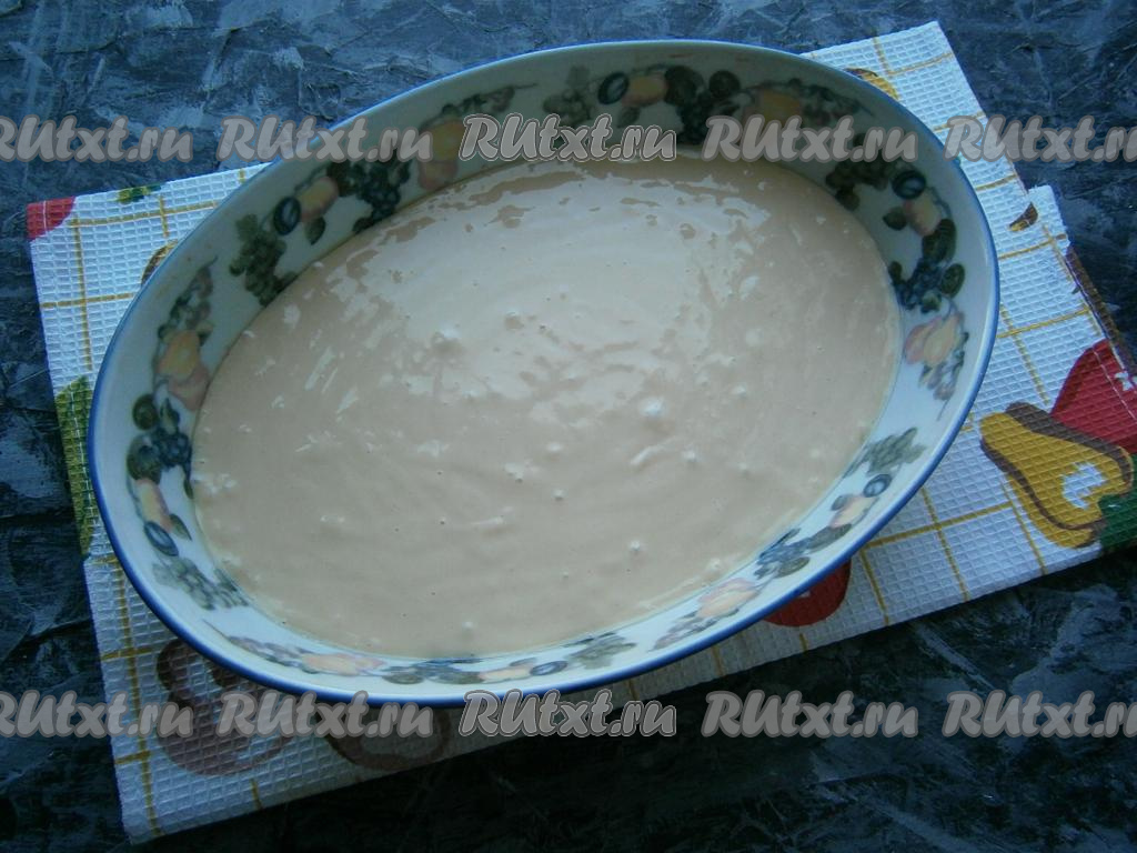 Вылить тесто в форму (приблизительно размер формы 16х26 см), предварительно прогретую в духовке и смазанную сливочным маслом.