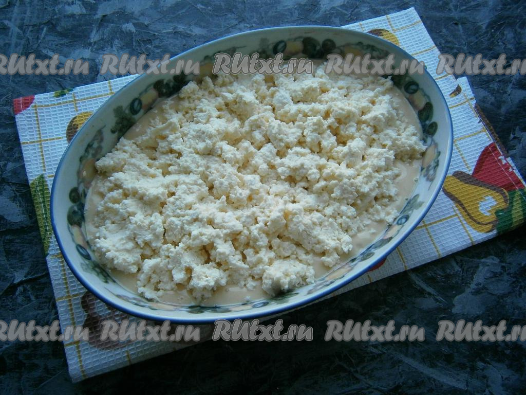 Творожную массу выложить поверх теста, стараясь уложить ровным слоем.
