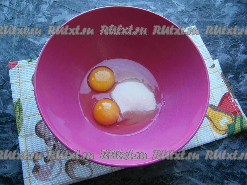 Для приготовления теста вбить яйца в глубокую миску, добавить сахар и соль.