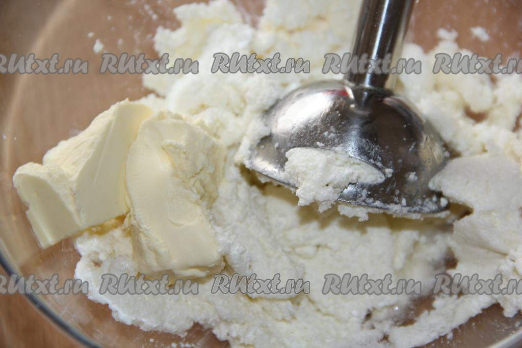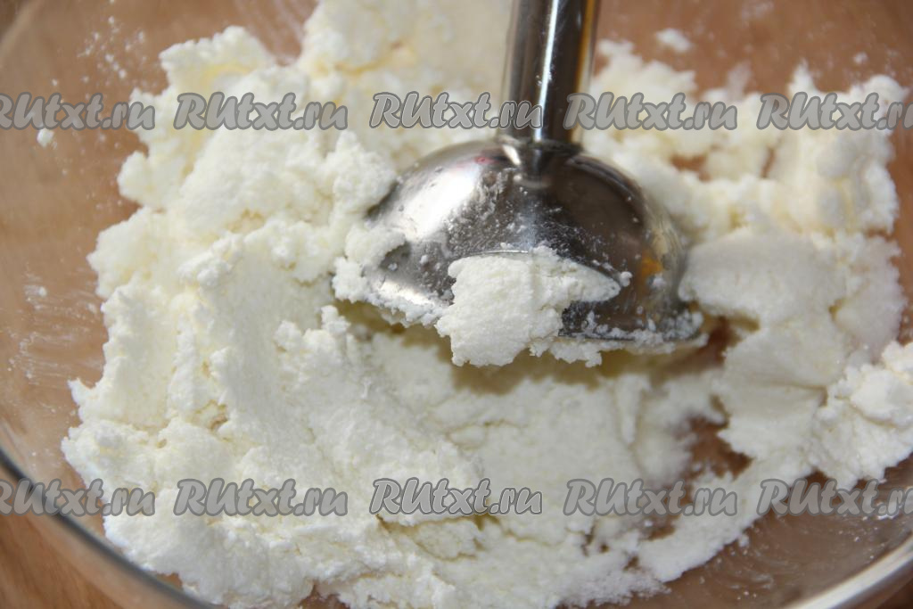 Пробить творог погружным блендером.