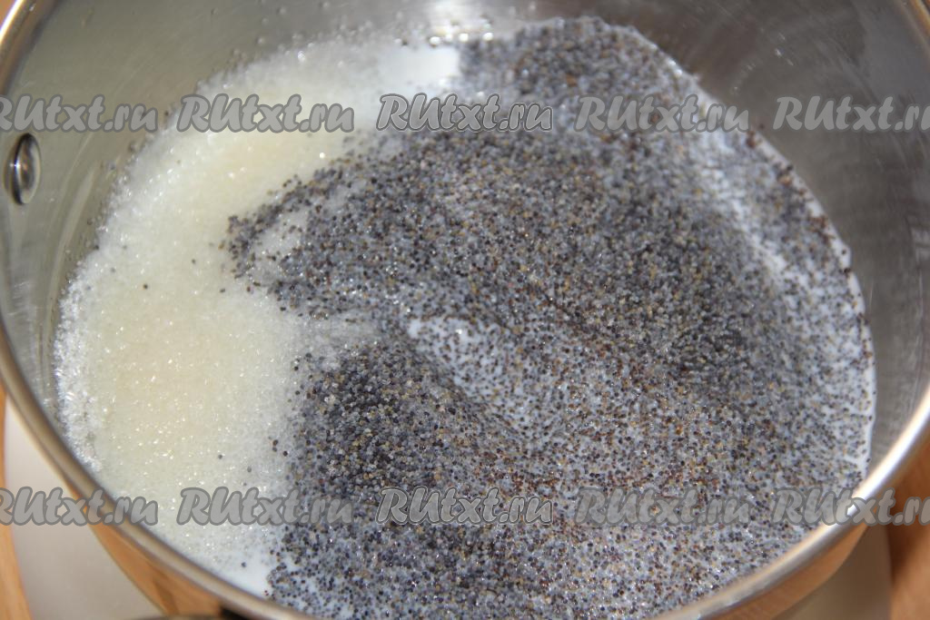 Для приготовления маковой начинки насыпать в кастрюлю мак, добавить сахар и молоко.