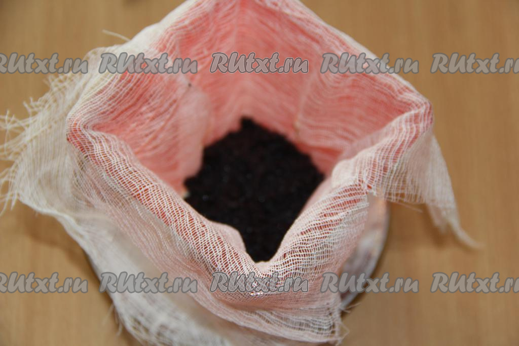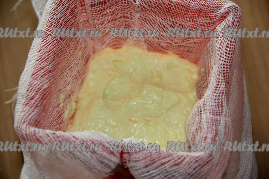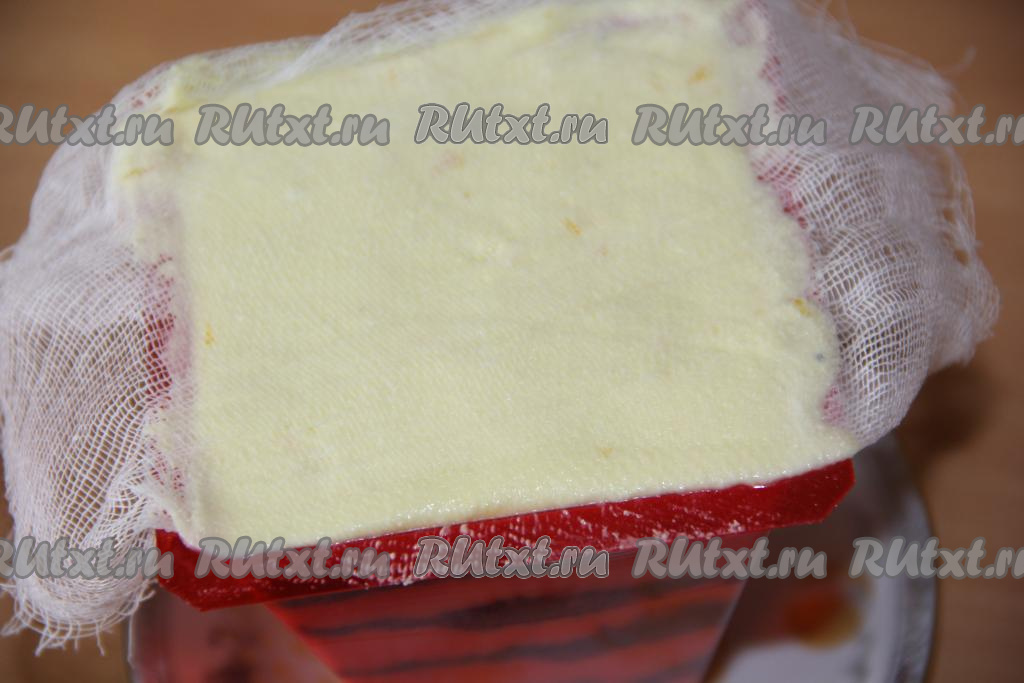 Форму для творожной пасхи (объём моей формы 450 мл) выложить марлей в два слоя. Края марли должны свисать с формы. На дно выложить немного маковой начинки.