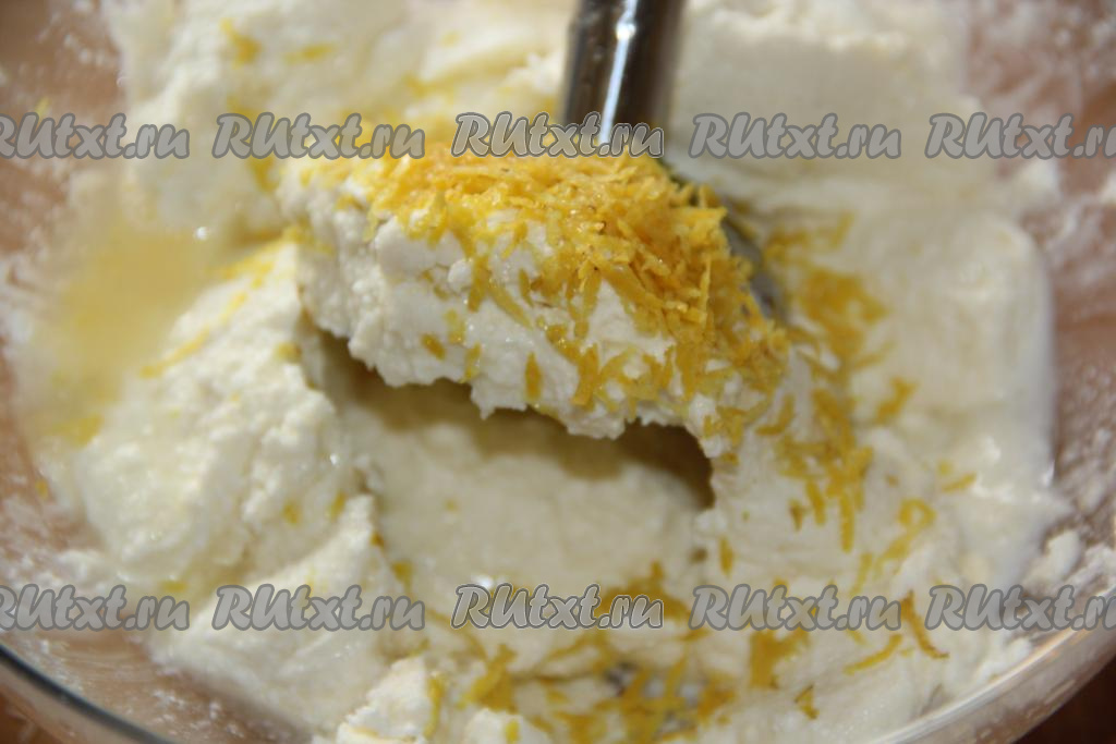 Лимон вымыть, снять с него цедру. Из 1/2 лимона выдавить сок. В творожную массу добавить сок и цедру.