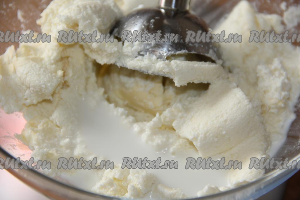В получившуюся творожную массу влить 20 мл молока (или сливок любой жирности), пробить блендером.