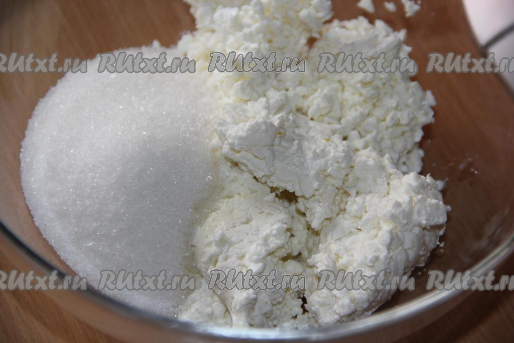 Для приготовления творожной массы в отдельной ёмкости соединить творог и сахар.