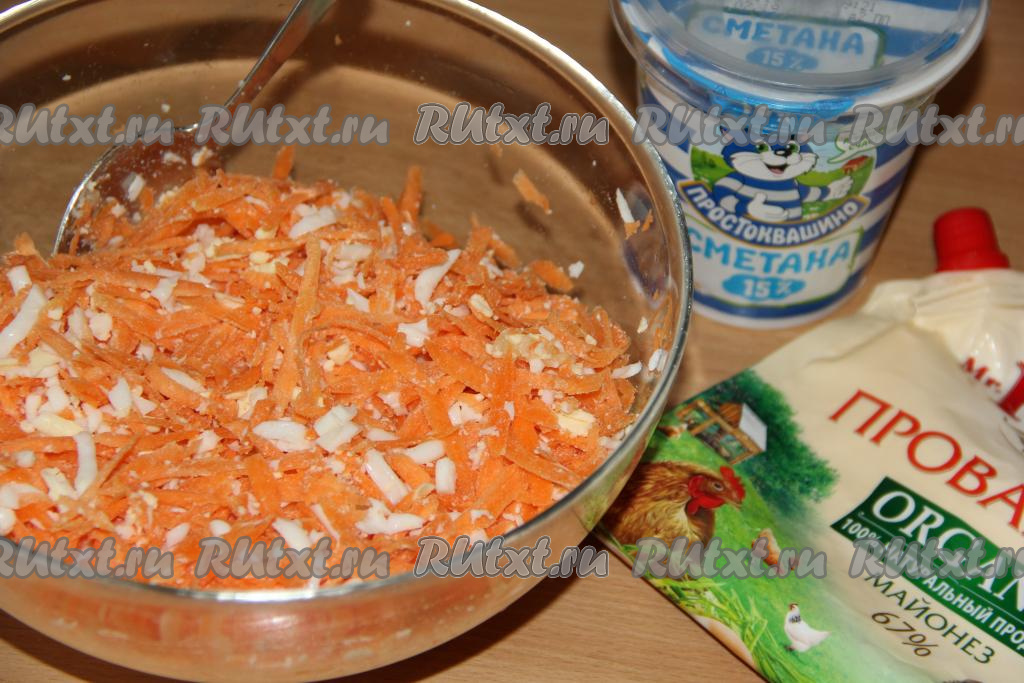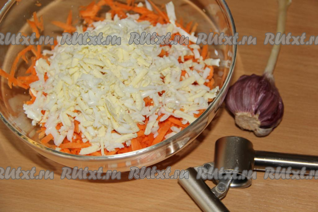 Яйца натереть на тёрке и вместе с зубчиками чеснока, пропущенными через пресс, добавить к моркови.