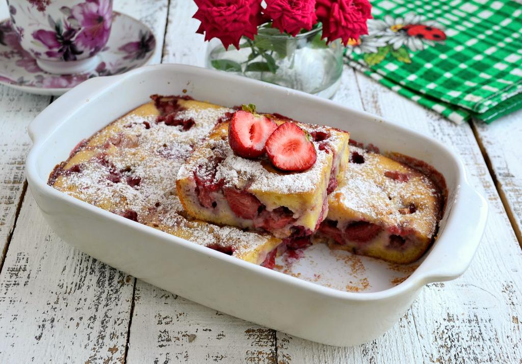 Необычайно ароматному и вкусному десерту дать немного остыть в форме, посыпать сахарной пудрой. Затем разрезать клафути с клубникой на части и можно подавать к столу.