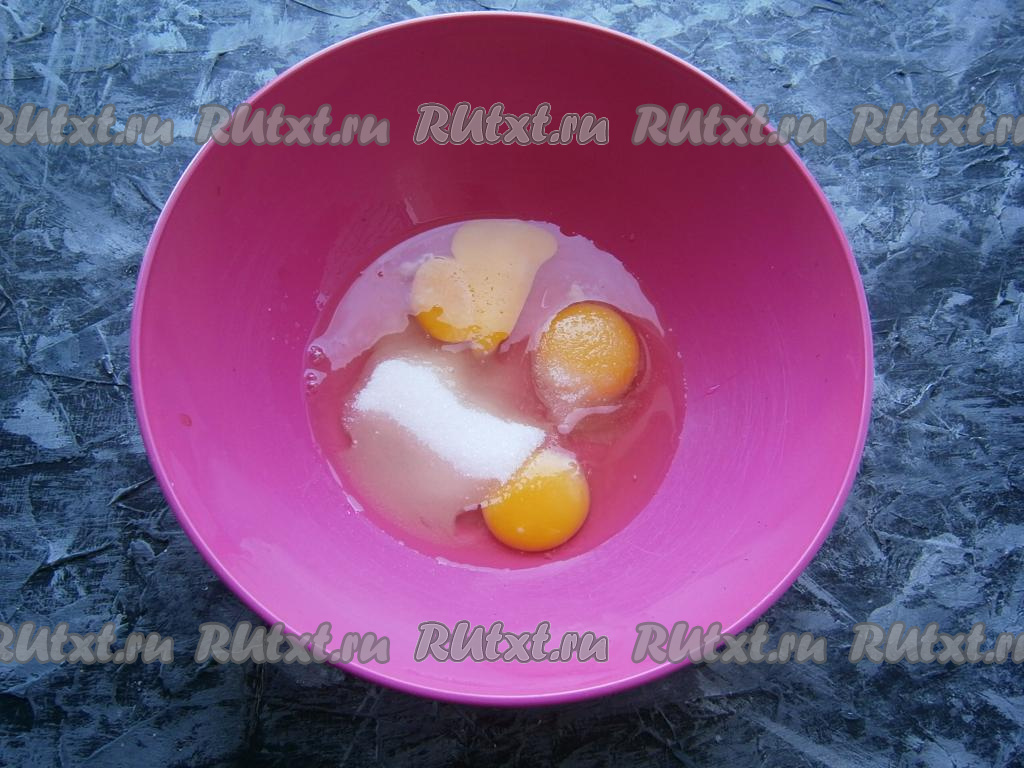 Разбить яйца в миску, затем всыпать сахар и ванильный сахар.