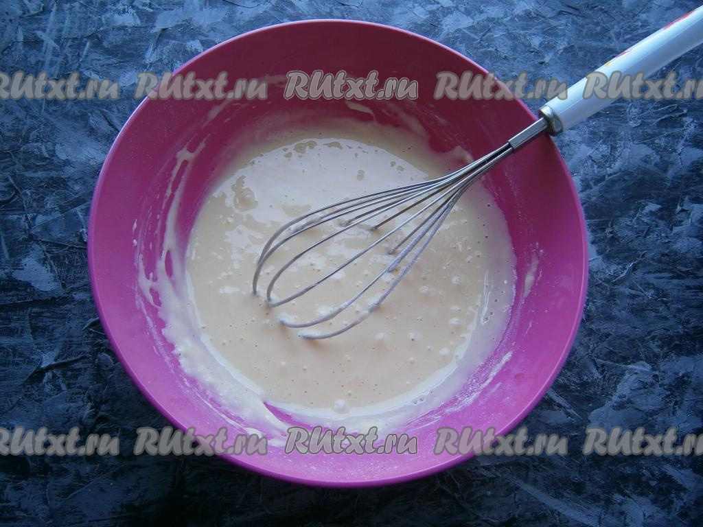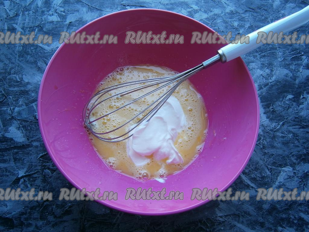 Яйца с сахаром тщательно взбить венчиком, затем добавить сметану, перемешать венчиком.