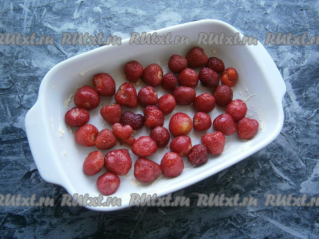 Клубнику вымыть, обсушить. Смазать сливочным маслом форму для выпечки (у меня форма размером 23х16 см). В подготовленную форму выложить целые ягоды клубники.