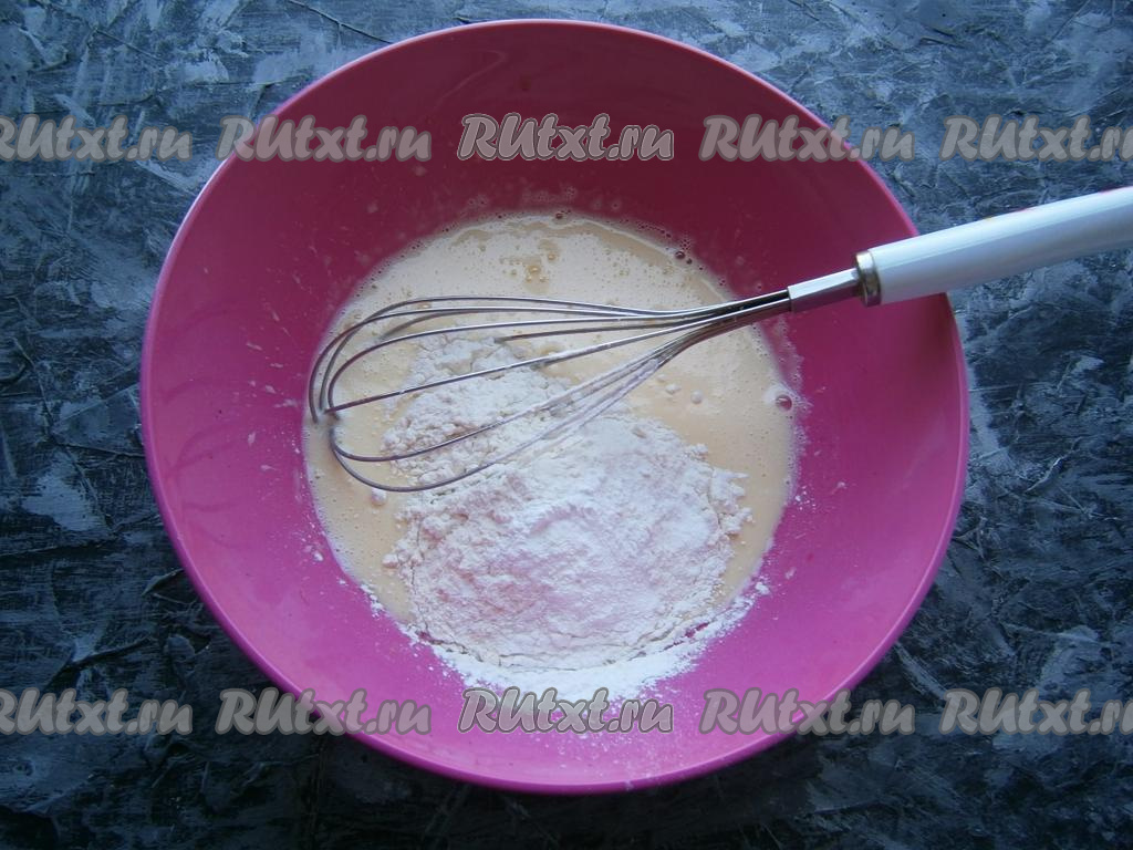 Затем всыпать муку и разрыхлитель, венчиком перемешать до однородности.