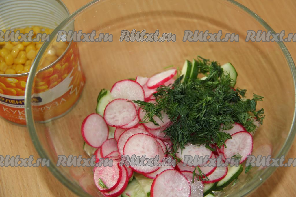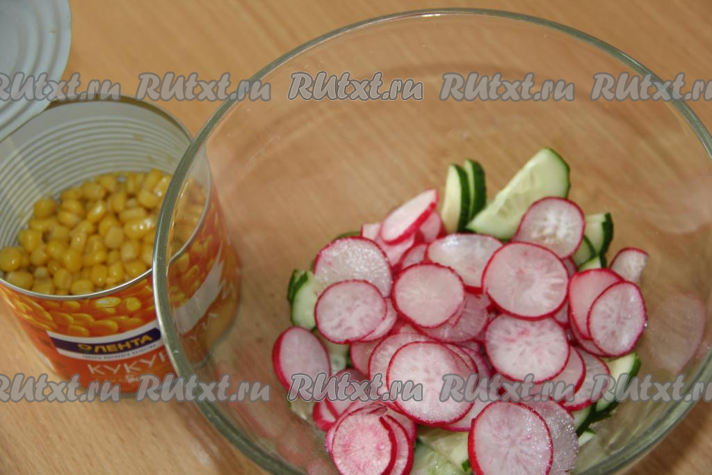 Редиску вымыть и нарезать кружочками. Соединить огурцы и редиску. С кукурузы слить жидкость.