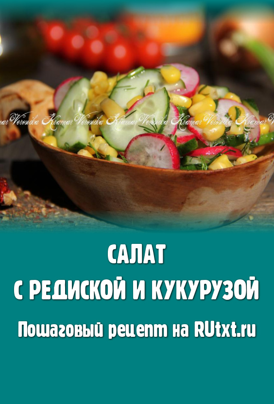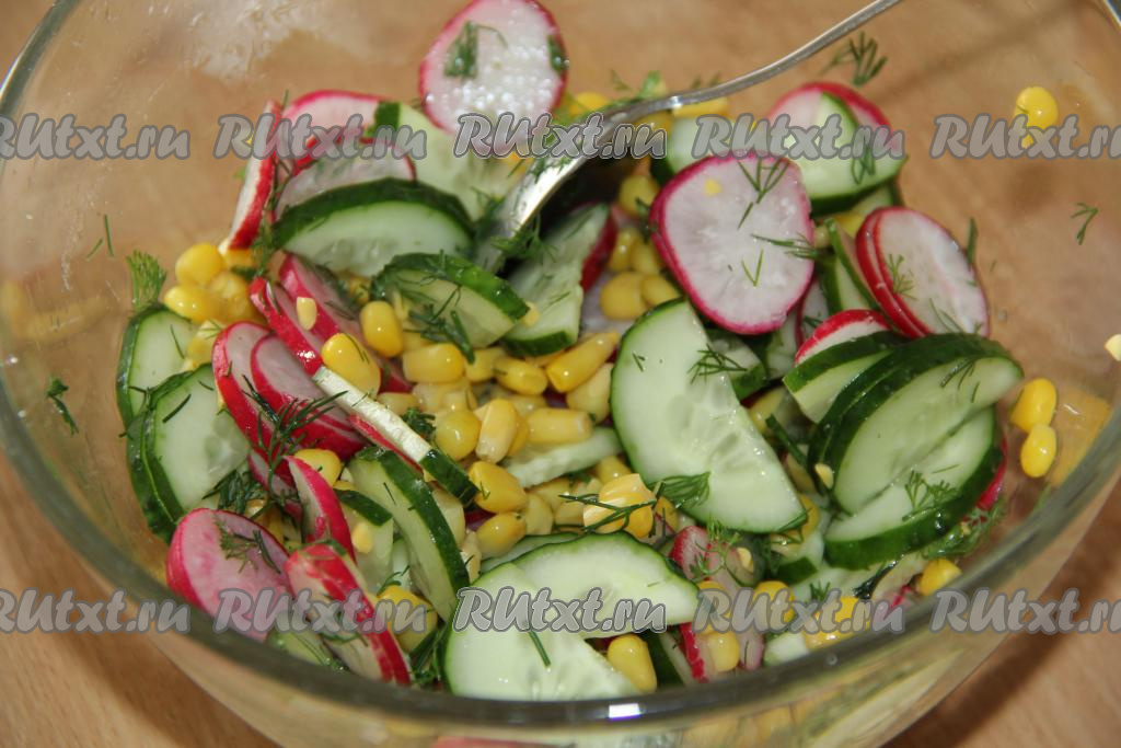 Сочный, яркий, вкусный салат с редиской и кукурузой лучше заправлять непосредственно перед подачей (я заправила оливковым маслом). Этот простой салатик, приготовленный за считанные минуты, отлично разнообразит меню и станет прекрасным дополнением ко многим блюдам!