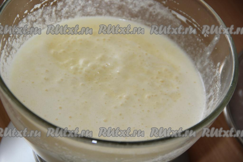 В яичную массу добавить кефир и растопленное масло, взбить миксером в течение минуты.