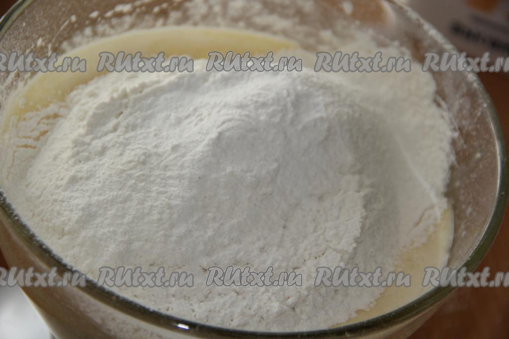 Всыпать разрыхлитель, начать частями добавлять муку, каждый раз тщательно вмешивая её столовой ложкой (или лопаткой). Муки, в зависимости от величины яиц и жирности кефира, может потребоваться немного больше или меньше. Тесто должно получиться в меру густым, воздушным, напоминающим сметану средней жирности.