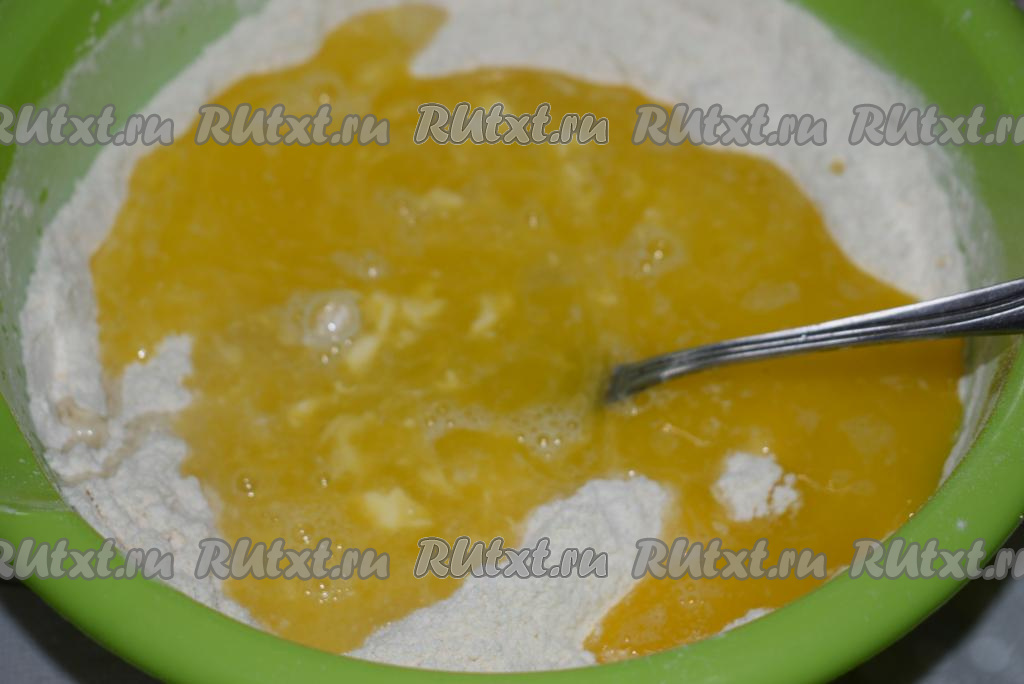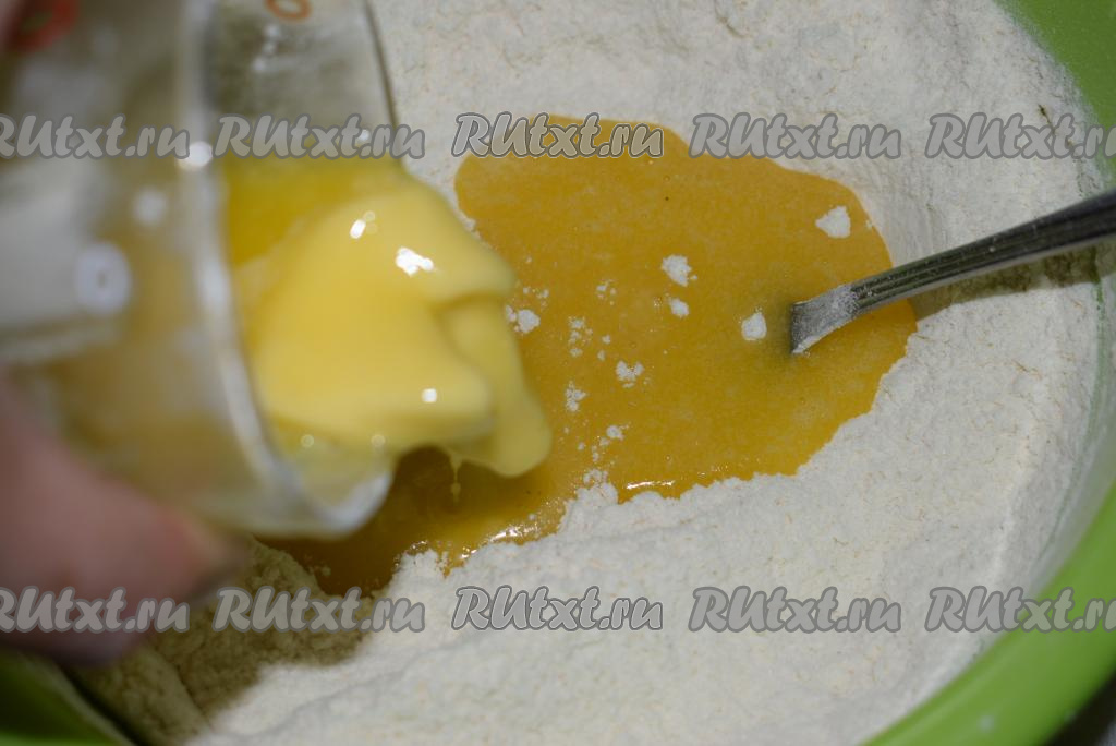 Растапливаем до мягкости сливочное масло в микроволновке в течение 1 минуты (масло не должно быть очень горячим) и добавляем его в мучную смесь.