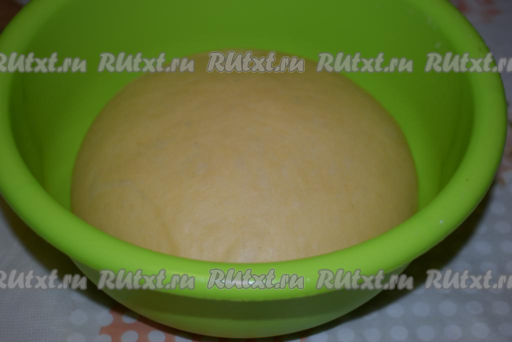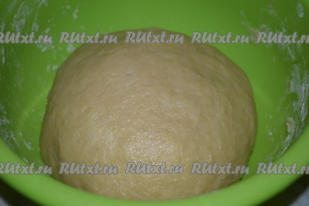 Вымешиваем тесто, примерно, 10 минут, хорошо разминая его руками. Готовое дрожжевое тесто будет мягким, нежным, оно совершенно не липнет к рукам и хорошо держит форму. Накрываем тесто плёнкой и оставляем на расстойку в тёплом место, примерно, на 1 час. За это время тесто "вырастет" и хорошо увеличится в объёме.