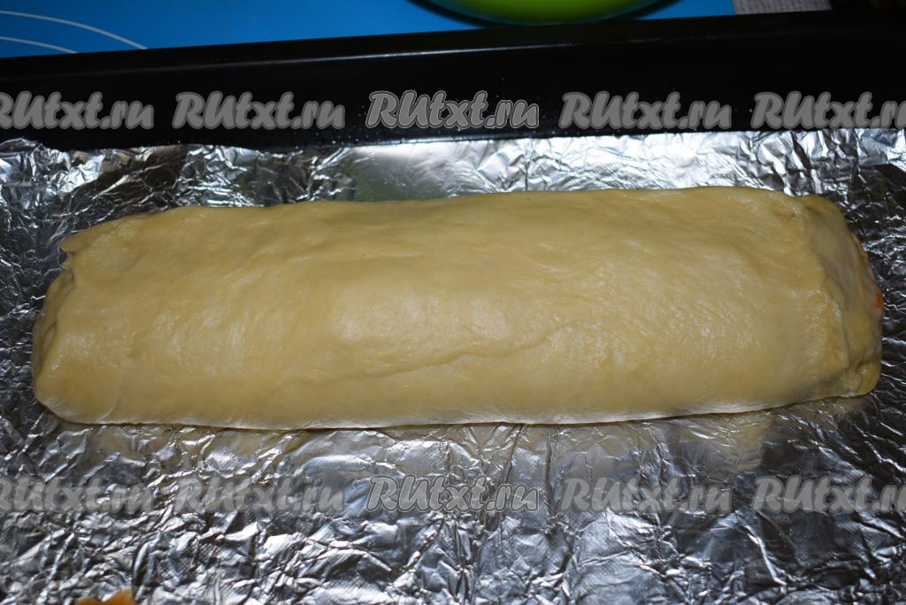 Аккуратно скручиваем тесто с абрикосовой начинкой в рулет. Края рулета плотно защипываем.