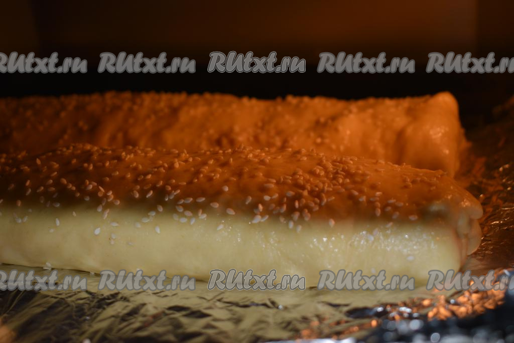 Таким же образом формируем и второй рулет. Выкладываем рулеты с абрикосовой начинкой на противень, застеленный пергаментом (или фольгой), сверху смазываем взбитым яйцом и посыпаем кунжутом.
