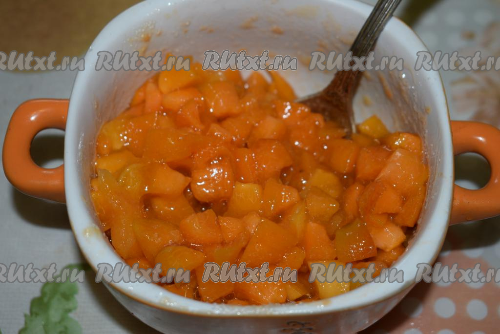 Когда дрожжевое тесто будет готово, добавляем к нарезанным абрикосам сахар и крахмал (делаем это не заранее, а в самый последний момент, для того чтобы абрикосы не пустили много сока), перемешиваем и начинка для рулетов готова.