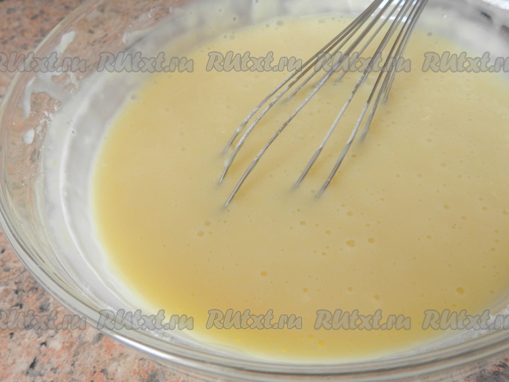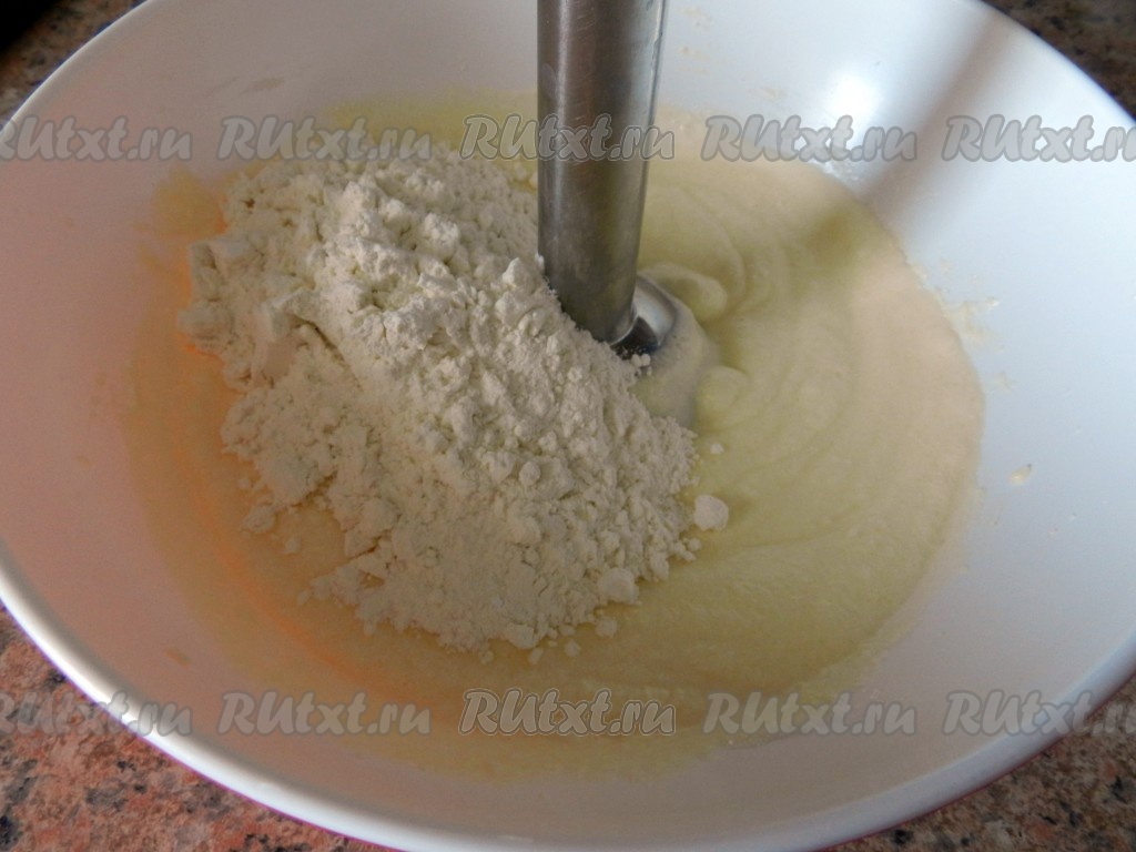 Добавить муку с разрыхлителем и замесить мягкое тесто.