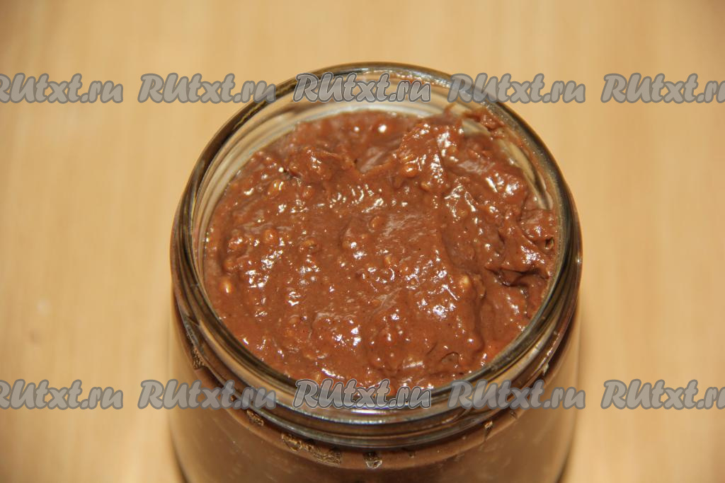 Переложить шоколадно-ореховую пасту, приготовленную в домашних условиях, в банку, закрыть крышкой и полностью охладить. У меня получилось 300 грамм пасты.
