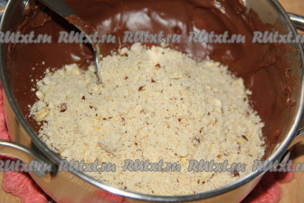 В горячую массу выложить шоколад, поломанный на небольшие кусочки, перемешать.