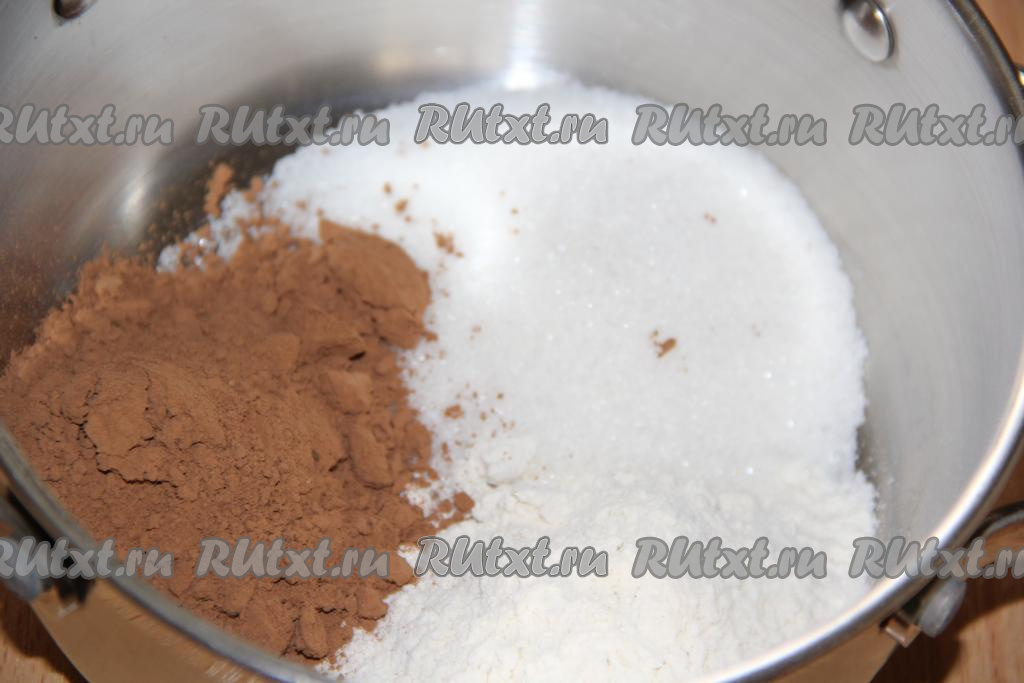 К какао, сахару и муке добавить молоко, перемешать венчиком. Поставить кастрюлю на огонь.