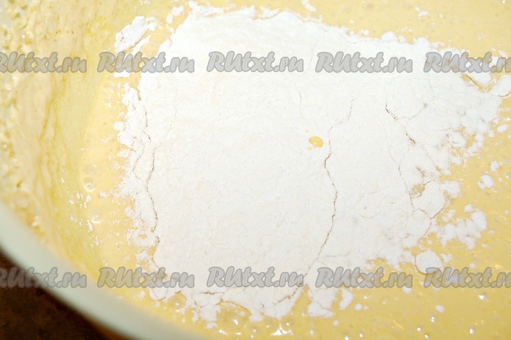 Просеять муку в миску, добавить к ней разрыхлитель и соль. Перемешать и отставить в сторонку.