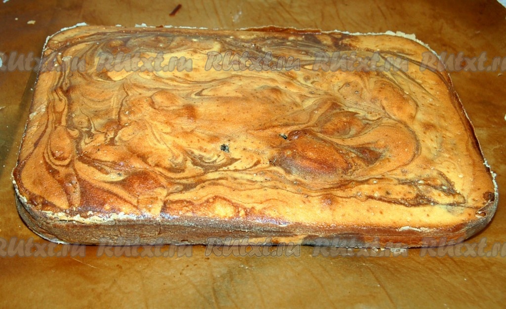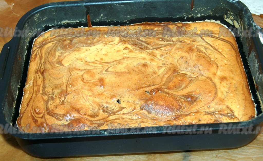 Вылить тесто в подготовленную форму, чередуя обычное тесто с шоколадным. Сверху сделать разводы с помощью острого предмета (поводить кругами). Отправить мраморный пирог в заранее нагретую до 180 градусов духовку. Выпекать от 40 до 50 минут.