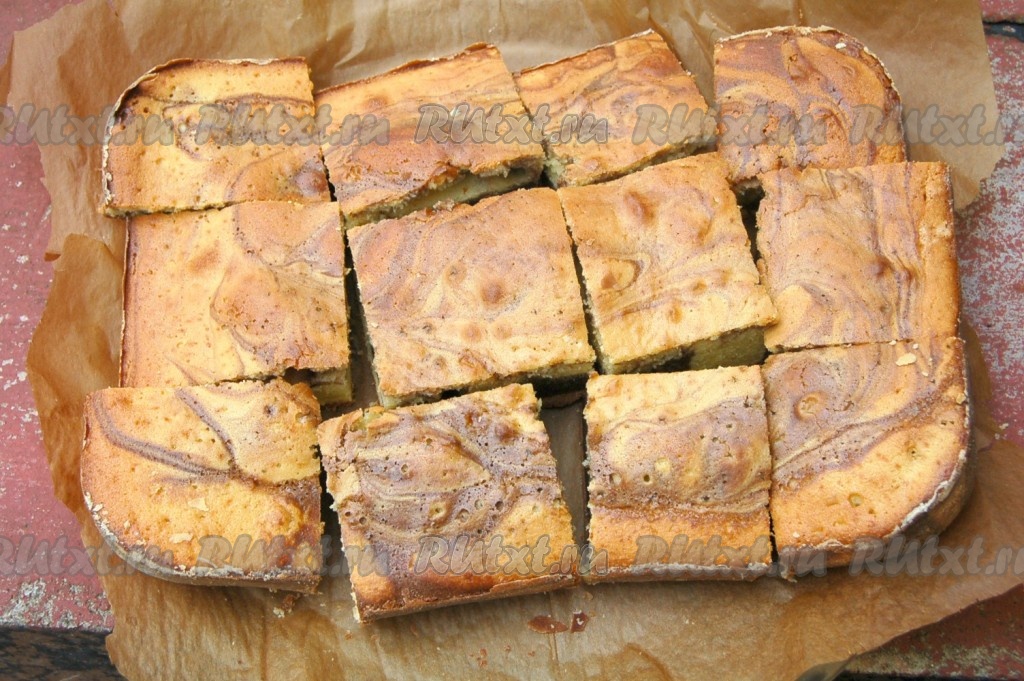 Остудить мраморный пирог, разрезать на порционные кусочки и можно наливать чай.