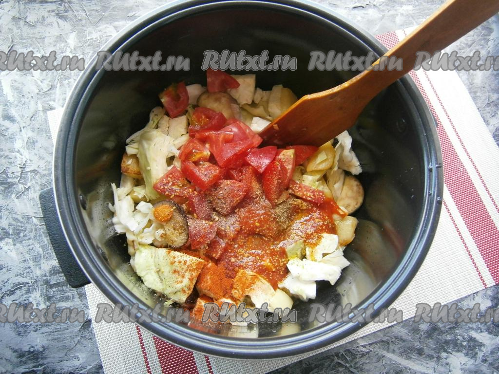 Добавить к овощам капусту, нарезанные произвольными кусочками свежие помидоры, любой томатный соус, всыпать соль, чёрный молотый и чили молотый перцы, специи для овощей, влить воду.