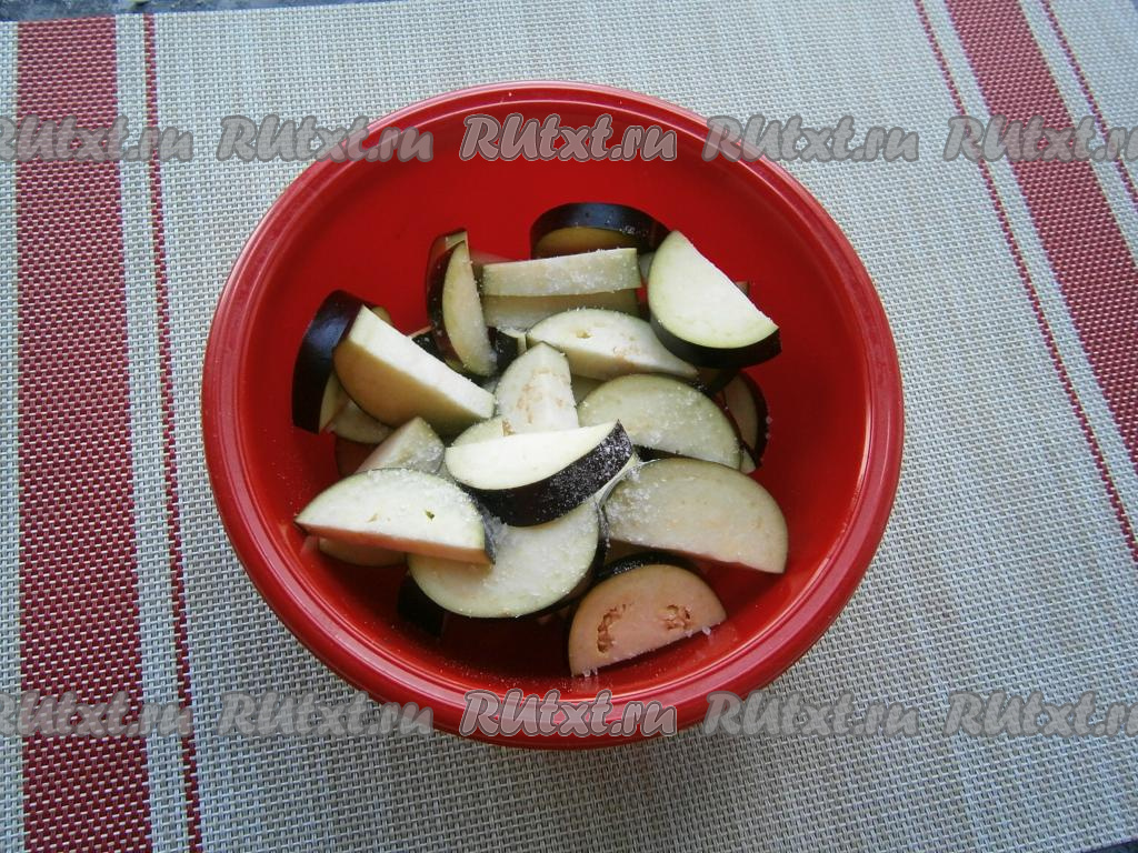 Из болгарского перца удалить семенную коробку. Лук, чеснок, картошку и морковь очистить. Баклажаны нарезать на довольно крупные кусочки, посолить, оставить на 15 минут.