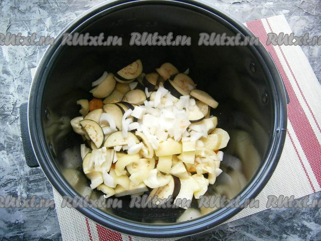 Выставить программу "Жарка" на 20 минут. Помешивая, готовить овощи 10 минут, после чего добавить баклажаны, лук и болгарский перец, перемешать, готовить далее, иногда перемешивая, до окончания программы.