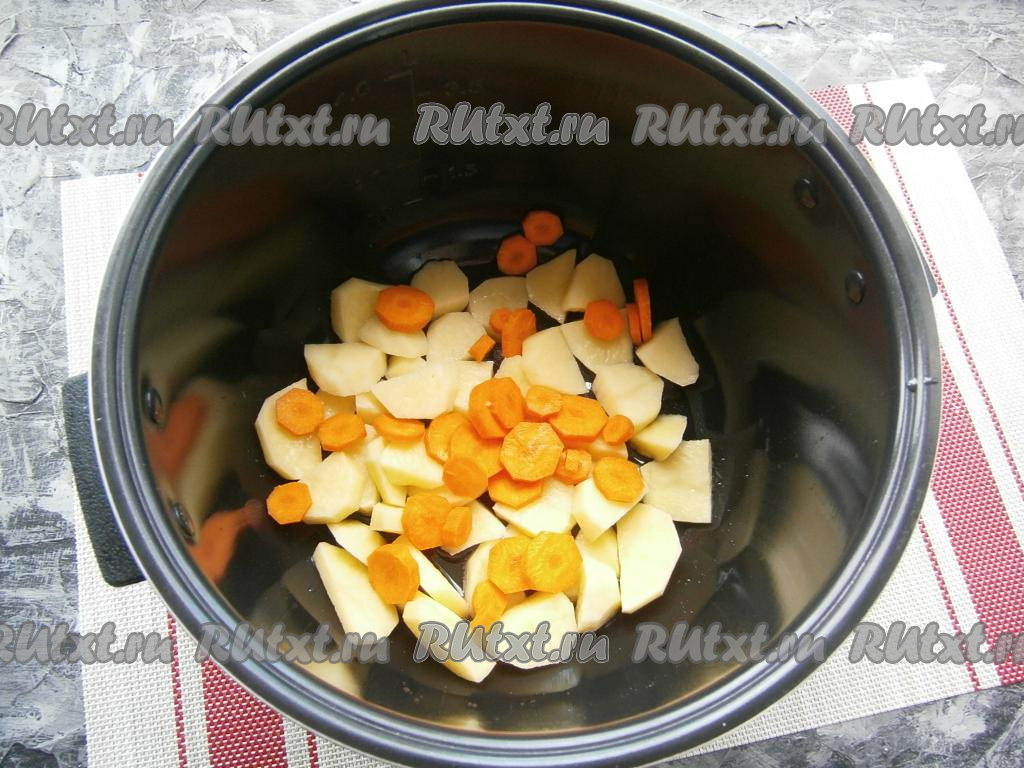 Растительное масло влить в чашу мультиварки, выложить картофель, добавить нарезанную не слишком тонкими кружочками морковь.