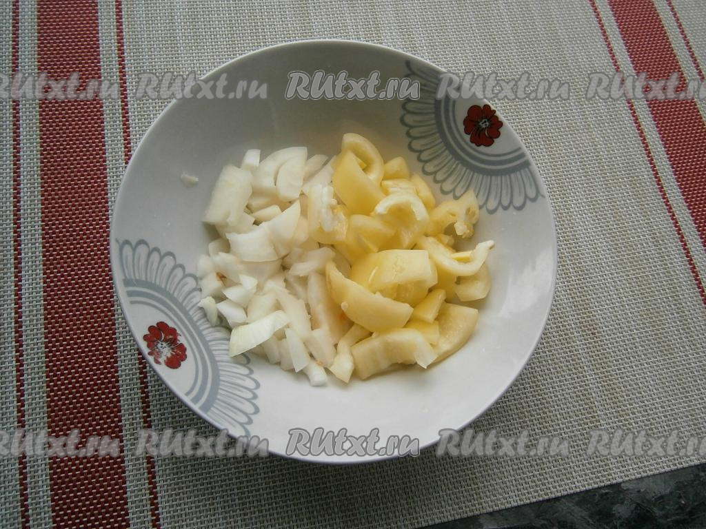 Лук и сладкий перец нарезать произвольно, но не мелко и не тонко.